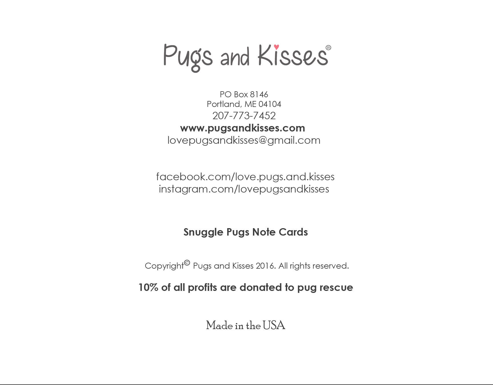 Thank you for supporting pug rescue! 10% of all proceeds from this card and all Pugs and Kisses products go directly to helping pugs in need. We are especially dedicated to supporting organizations that help senior pugs live out their lives in a loving and safe environment. Thank you for all of your help!